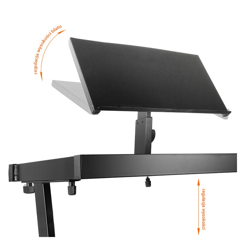 Η κύρια επιφάνεια του τραπεζιού DJ MOBILE PRO διαθέτει ρύθμιση ύψους σε 9 θέσεις, αυξάνοντας την εργονομία της εργασίας. Ακριβώς από πάνω της υπάρχει μια πρόσθετη, ανακλινόμενη προέκταση με ρύθμιση ύψους σε 5 θέσεις, στην οποία μπορούμε να τοποθετήσουμε, για παράδειγμα, έναν φορητό υπολογιστή.
